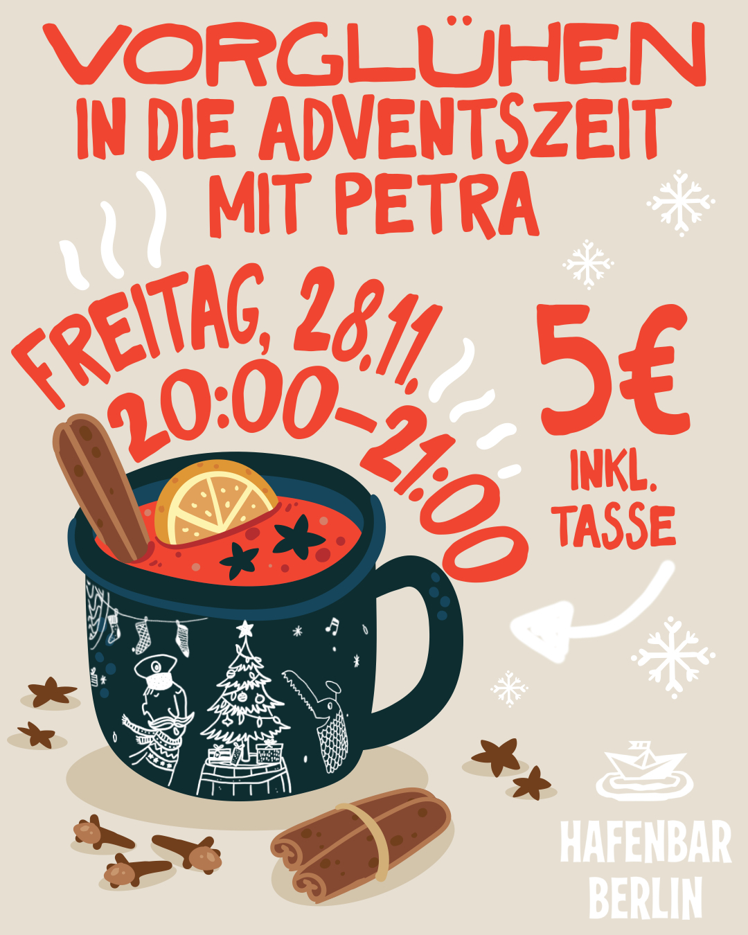Glaubt ihr, wir haben nicht mehr alle Tassen im Schrank? Stimmt. Bald vielleicht nicht mehr. Denn wir wollen unsere legendären Hafenbar-Weihnachtstassen mit euch teilen. Wir bauen zumVorGLÜHEN in die Adventszeit mit Euch am Freitag, den 28.11. ab 20:00 Uhr unseren Glühweinstand vor der Hafenbar auf. Hafenbar Glühwein aus der Hafenbar Weihnachtstasse! Eine Tasse Glühwein für 5 Euro: ABER im Gegensatz zum Weihnachtsmarkt dürft ihr die Tasse dann behalten. Die Tasse kostet im Shop ohne Glühwein 10€! Merkt ihr selber, oder! Also…kommt vorbei: Vorglühen mit Käptin Petra vor der Hafenbar am Freitag, den 28. November ab 20:00 Uhr!
